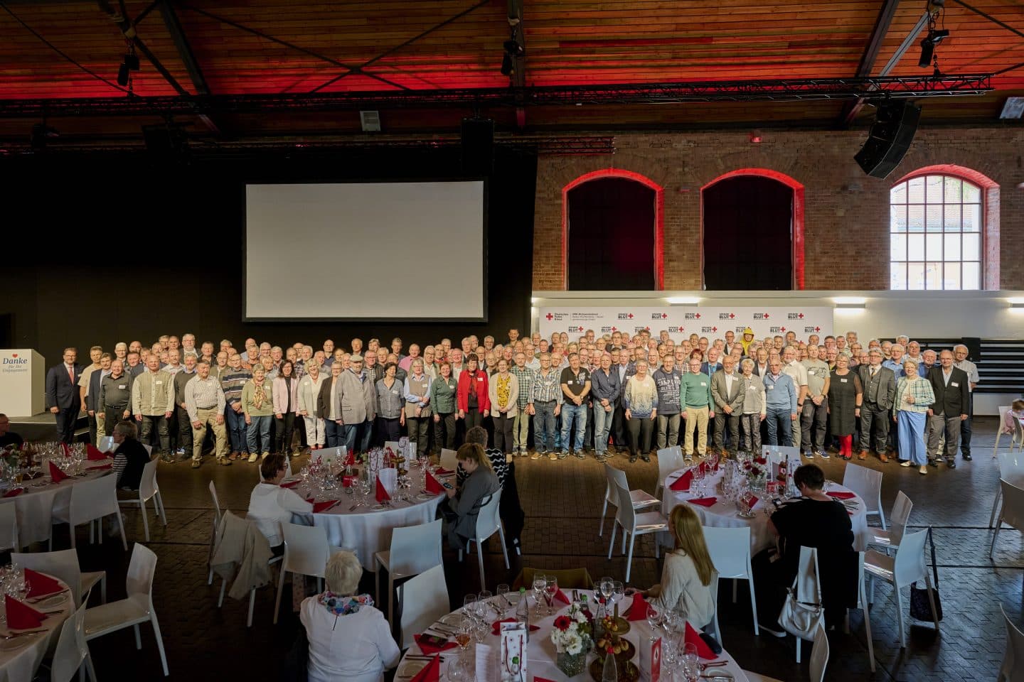 Die Bühne leuchtet in Rot und Weiß, auf den Tischen glänzen Namensschilder und Ehrennadeln.