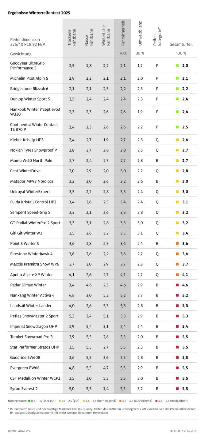 - Sieger: Goodyear UltraGrip Performance 3 (Note 2,0, Laufleistung 76.000 km)
