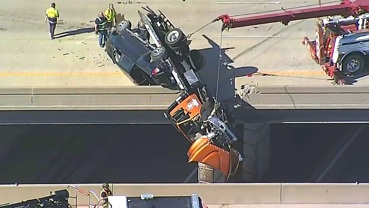 Dramatische Szenen auf einer Autobahn in McKinney im US-Bundesstaat Texas: Ein Abschleppwagen blieb nach einem Ausweichmanöver an einer Brücke hängen. Der Fahrer konnte spektakulär aus der baumelnden Fahrerkabine gerettet werden.