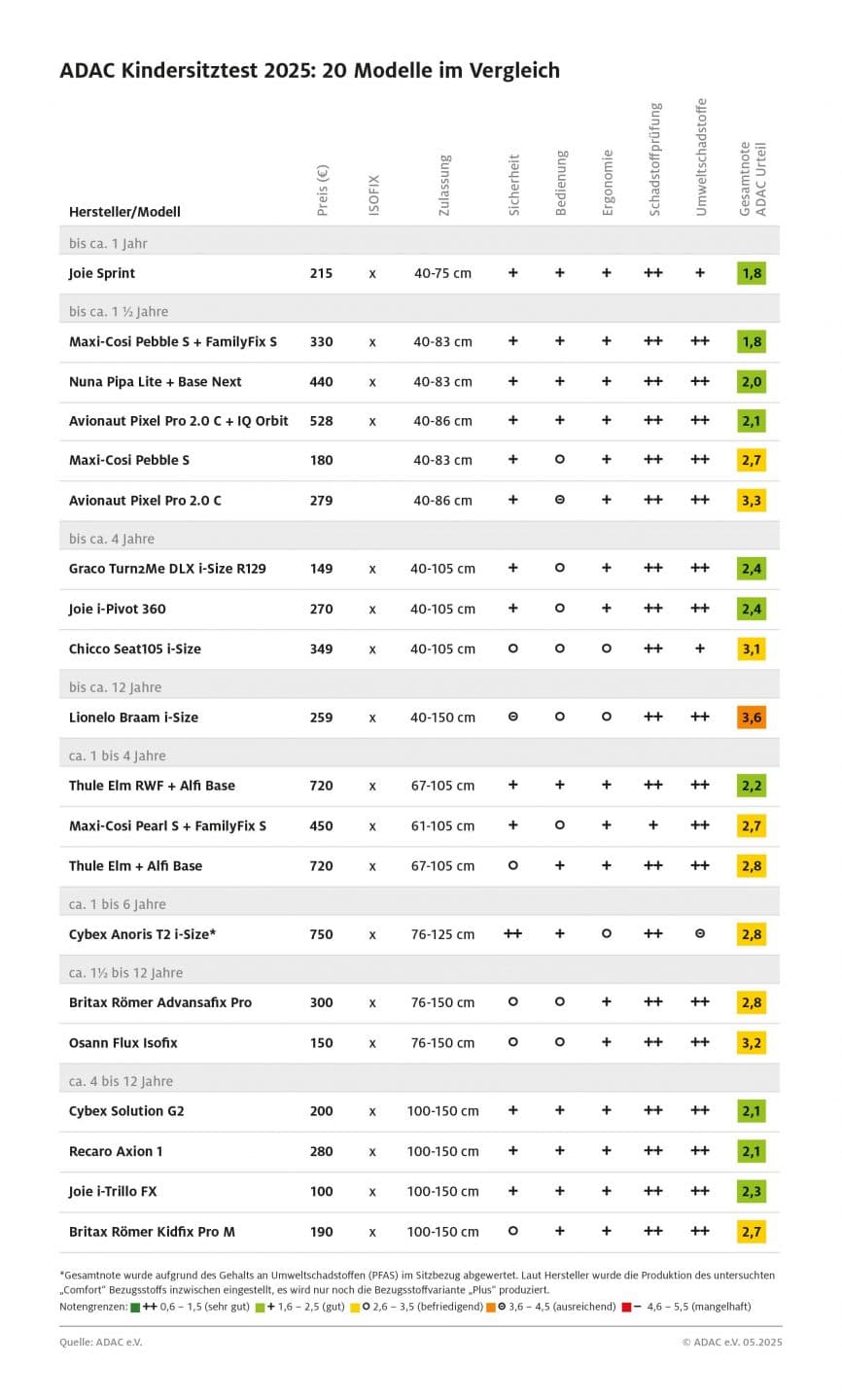 Ein „sehr gut“ in der reinen Sicherheitsbewertung (Frontal- und Seitenaufprall) erzielte nur der „Cybex Anoris T2 i-Size“ (Gesamtnote 2,8). Der Sitz für Kinder zwischen einem und sechs Jahren bietet laut ADAC einen „sehr guten Schutz“. Allerdings ist er mit 750 Euro auch das teuerste Modell im Test. Zudem wurden Umweltschadstoffe im Bezugsstoff nachgewiesen, was eine bessere Gesamtnote verhinderte. Wichtig: Laut Cybex wurde die betroffene Bezugsstoffvariante „Comfort“ Anfang des Jahres eingestellt und nur noch die Variante „Plus“ produziert.