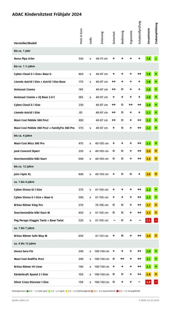 Trotz dieser negativen Ausreißer gibt es auch viele positive Testergebnisse. Insgesamt wurden 24 Modelle geprüft, von denen 15 mit der Note „gut“ abschnitten. Besonders erfreulich sind die Ergebnisse bei den Babyschalen für die Kleinsten (40 bis 87 cm), wo das Modell „Nuna Pipa Urbn“ als Spitzenreiter die Note 1,6 erreichte. Auch bei den Kleinkindersitzen bis 105 cm schnitten der „Maxi-Cosi Mica 360 Pro“ und der „Cybex Sirona GI i-Size“ mit der Note 2,2 hervorragend ab. Für größere Kinder bis 150 cm erzielte der „Avova Sora-Fix“ mit der Note 2,0 eine sehr gute Bewertung.
