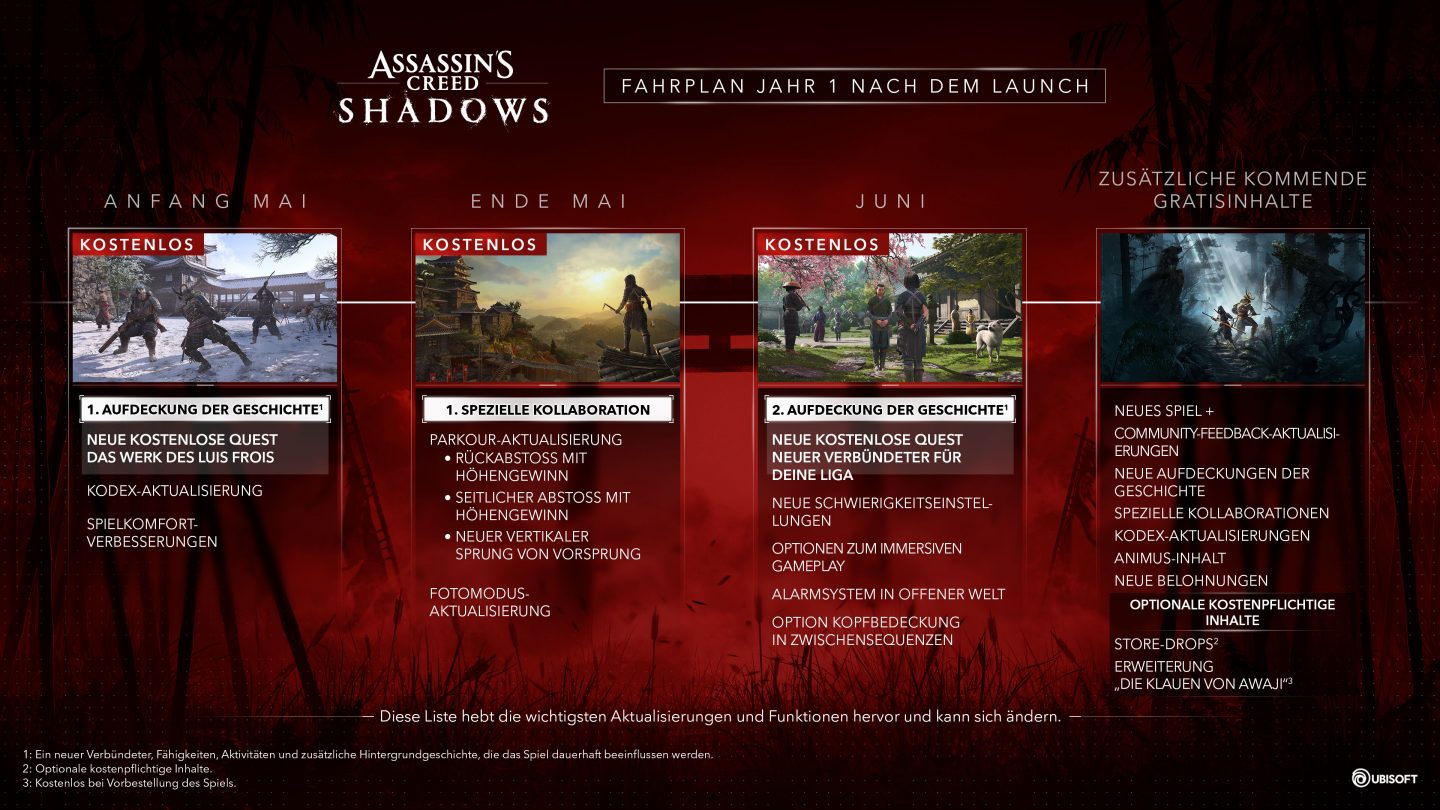Im Zentrum der Ankündigung steht das Versprechen, allen Besitzern von Assassin’s Creed Shadows kontinuierlich frischen Wind zu bieten. Ubisoft plant eine Reihe von Updates, die das Spiel erweitern und verbessern sollen. Diese kostenlosen Inhalte umfassen laut Publisher: