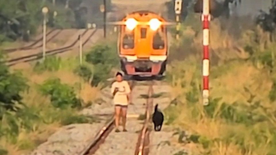 Eine Frau ging bei Bangkok in Thailand mit ihrem Hund auf Bahngleisen spazieren. Plötzlich näherte sich von hinten ein Zug – doch die Spaziergängerin war durch ihr Handy abgelenkt und bemerkte die Gefahr nicht.