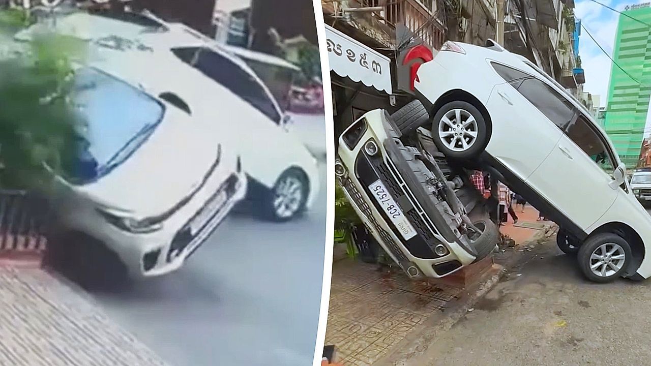 Seltsame Szenen ereigneten sich Mitte August auf den Straßen der kambodschanischen Hauptstadt Phnom Penh. Ein Autofahrer trat beim Ausparken aus Versehen den Rückwärtsgang durch. Das Fahrzeug rammte einen Wagen hinter sich und warf diesen komplett auf die Seite.