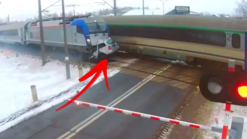 Dramatischer Vorfall auf einem Bahnübergang bei Warschau in Polen: Ein liegengebliebenes Auto wurde von einem herannahenden Zug erfasst und Sekunden später von einer zweiten Lokomotive aus der Gegenrichtung getroffen. Polizei und Passanten mussten hilflos zusehen.