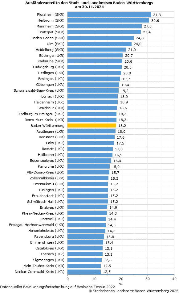 Absoluter Spitzenreiter beim Ausländeranteil ist der Stadtkreis Pforzheim mit 31,3 Prozent. Dichtauf folgen die Stadtkreise Heilbronn (30,6 Prozent) und Mannheim (27,8 Prozent). Ganz anders sieht es in ländlicheren Regionen aus: Im Neckar-Odenwald-Kreis und im Main-Tauber-Kreis liegt der Anteil mit jeweils 12,5 Prozent am niedrigsten.