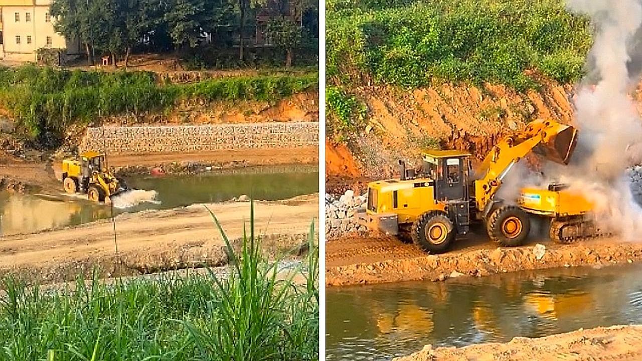 Auf einer Baustelle in der chinesischen Provinz Guangdong ging ein Bagger in Flammen auf. Der Fahrer eines Frontladers reagierte geistesgegenwärtig – und wurde kurzerhand zum Feuerwehrmann.