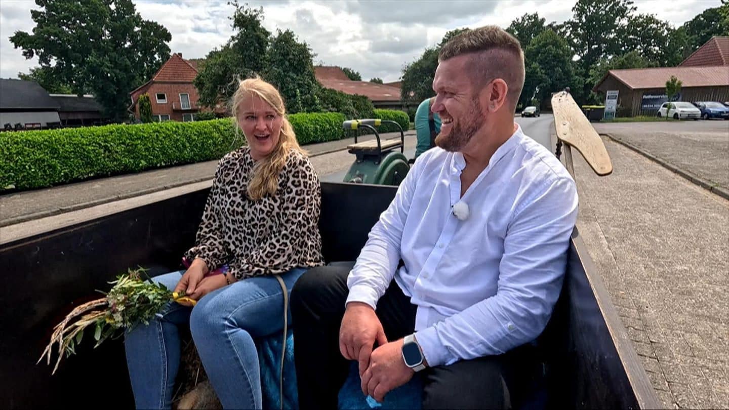 Pferdehofbetreiberin Insa (29) freut sich auf ihr erstes Kennenlernen mit Christoph (37) – und das ganz stilecht! Mit einem Traktor samt Strohballen-Anhänger holt sie den Hamburger ab. Schon beim ersten Blick zwischen beiden liegt etwas in der Luft.