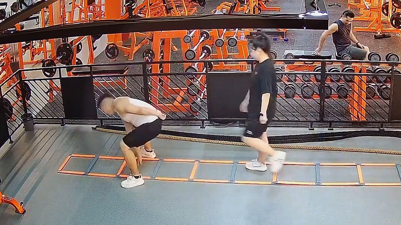 Eine Frau trainierte in einem Fitnessstudio in der chinesischen Provinz Shandong mit ihrem Personal Trainer. Ins Schwitzen kam dabei allerdings nur einer der beiden.