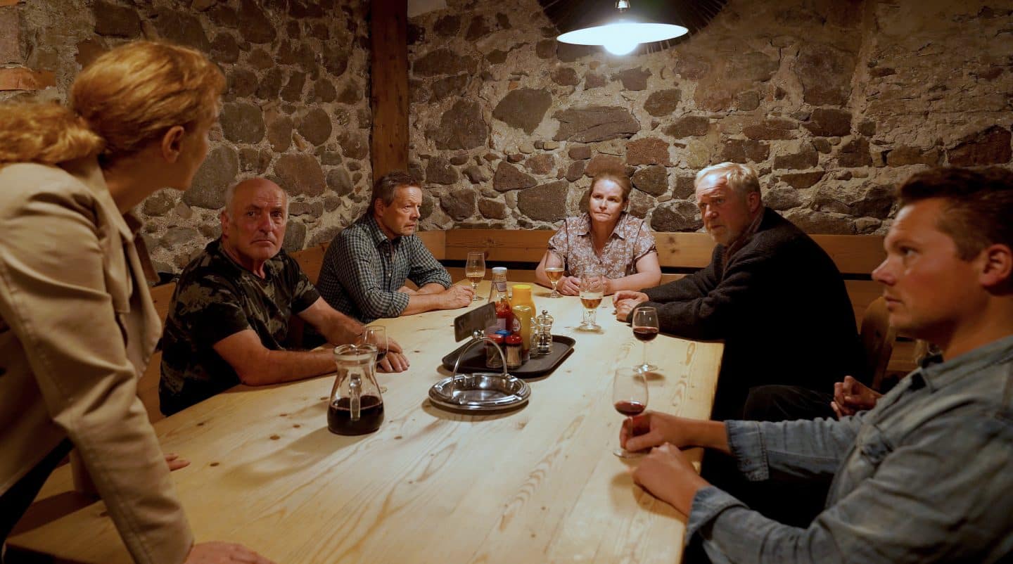 ARD Degeto BOZEN-KRIMI: MEIN IST DIE RACHE, am Donnerstag (19.06.25) um 20:15 Uhr und um 00:15 Uhr im ERSTEN. Capo“ Sonja Schwarz (Chiara Schoras, li.) macht Karl Brandl (Harald Krassnitzer, 2. v. li.), Roswitha Marl (Katrin Pollitt, 3. v. li.) und der restlichen Meute eine deutliche Ansage. © ARD Degeto/Hans Joachim Pfeiffer, honorarfrei – Verwendung gemäß der AGB im engen inhaltlichen, redaktionellen Zusammenhang mit genannter Degeto-Sendung und bei Nennung „Bild: ARD Degeto/Hans Joachim Pfeiffer“ (S2+). ARD Degeto/Programmplanung und Presse, Tel: 069/1509-335, [email protected]