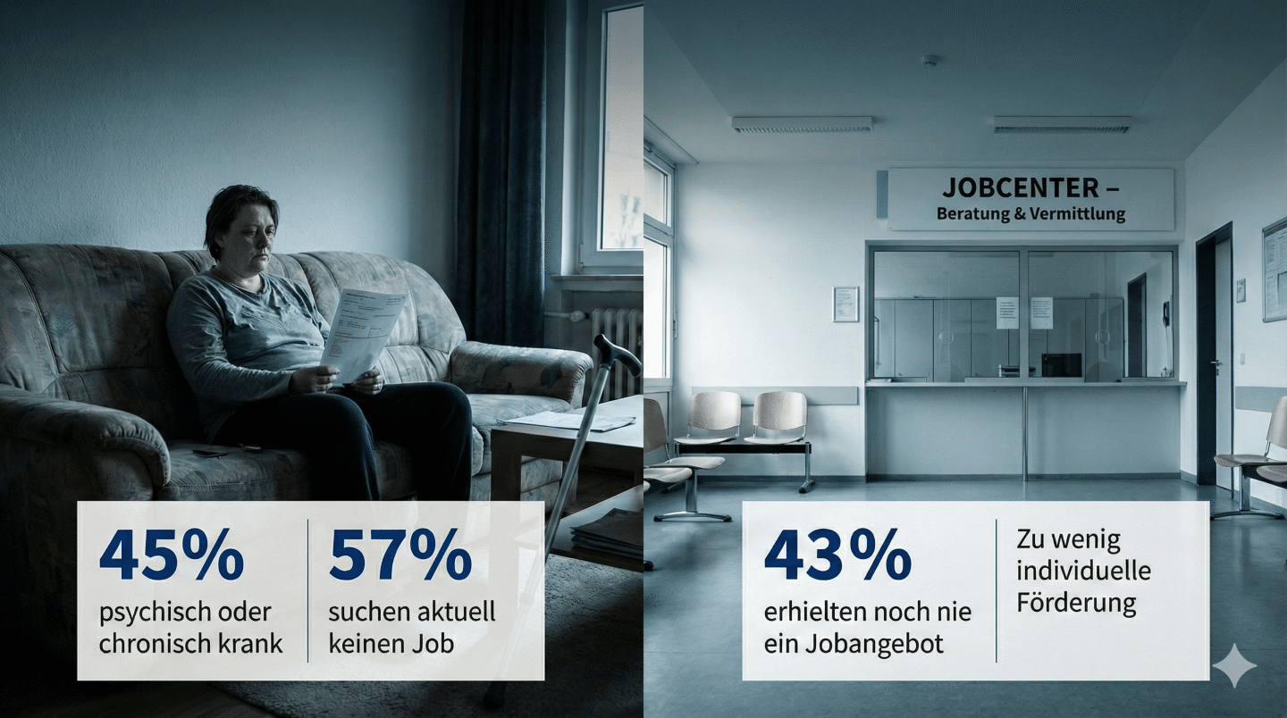 Der wohl schwerwiegendste Befund: 45 Prozent der Befragten leiden an psychischen oder chronischen Krankheiten. Unter denen, die aktuell gar nicht nach Jobs suchen, ist der Anteil sogar noch höher – 74 Prozent.