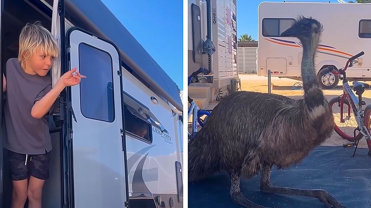 Im Monkey Mia in Australien bekam eine Familie beim Camping tierischen Besuch: Ein Emu setzte sich ganz entspannt vor ihr Wohnmobil und ruhte sich aus.
