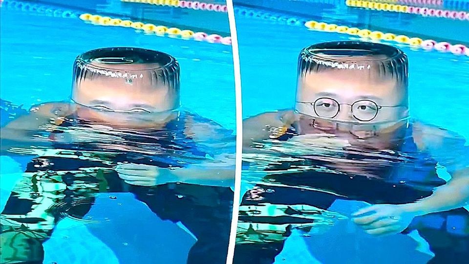 Ein Mann in der chinesischen Provinz Guangdong stand in einem Swimmingpool und sorgte für einen schrägen Effekt: Dank eines Tricks wirkte sein Gesicht wie ein Comic-Kopf.