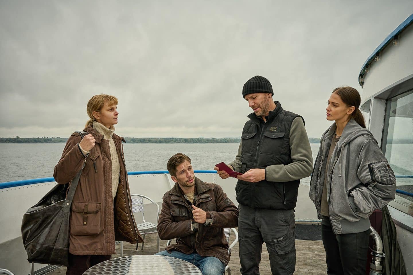 Hannah Sophia Brunner (Sinja Dieks, l.) und Philipp Brunner (Slavko Popadic, 2.v.l.) werden auf der Fähre von den Zollbeamten Simon Welke (Knut Berger, 2.v.r.) und Lara Kamp (Laura Berlin, r.) kontrolliert.