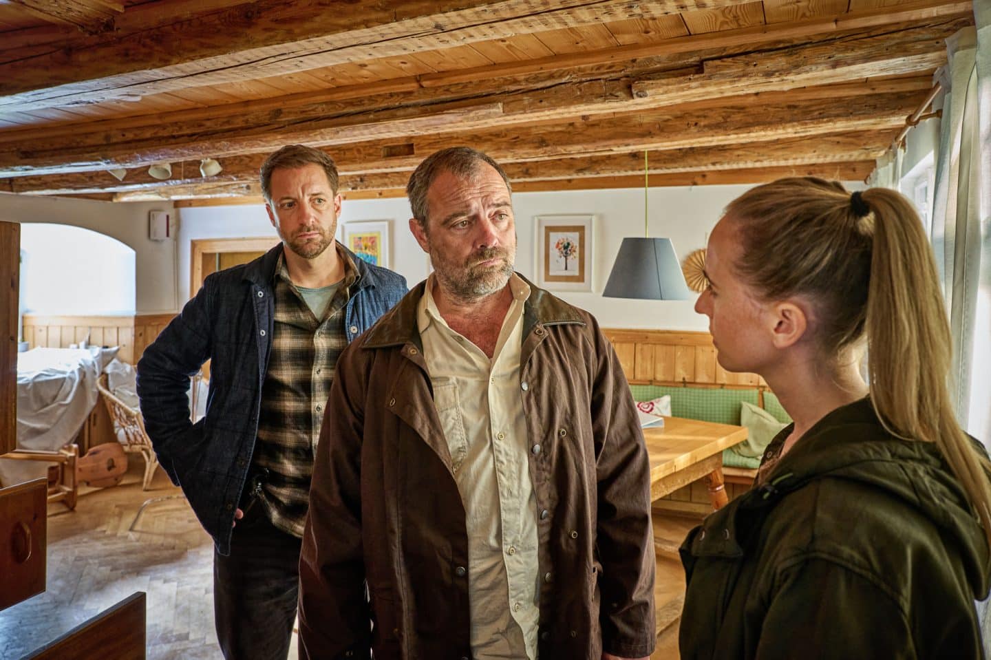 Annika Wagner (Nurit Hirschfeld, r.) und Martin Keller (Dominik Maringer, l.) befragen Dr. Jochen Krimmer (Juergen Maurer, M.)