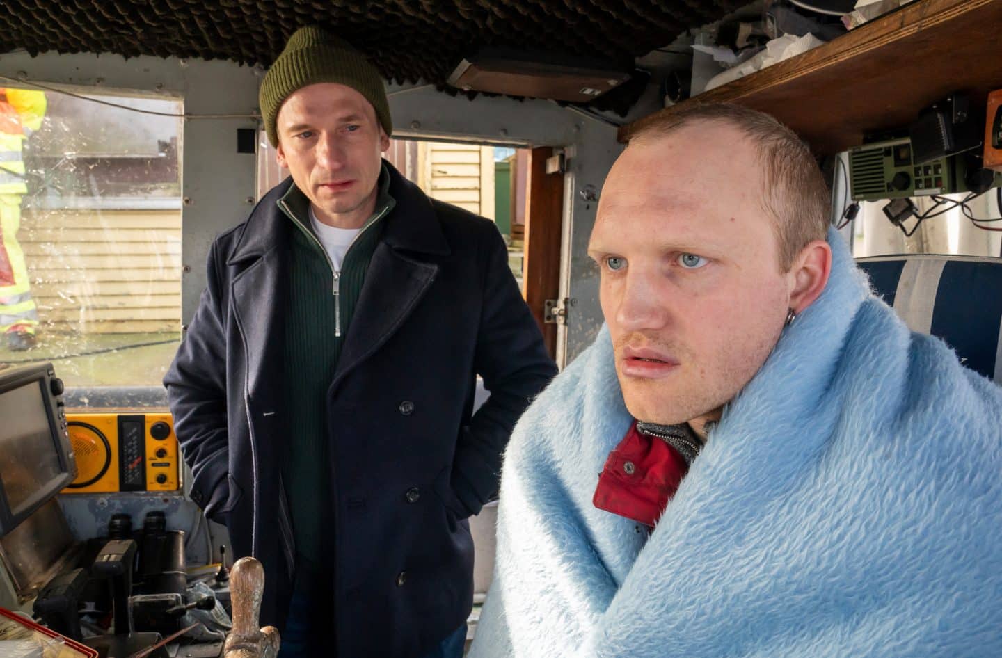 ARD/NDR GEISTERNETZE – DER USEDOM-KRIMI, am Donnerstag (30.10.25) um 20:15 Uhr im ERSTEN. Kommissar Rainer Witt (Till Firit) befragt Erik Petersen (Sammy Scheuritzel). Erik wollte den Fischkutter verkaufen, seine Schwester Suntje hingegen ein Umweltprojekt starten. Darüber gerieten die Geschwister in Streit. © NDR/ARD Degeto Film/Oliver Feist , honorarfrei – Verwendung gemäß der AGB im engen inhaltlichen, redaktionellen Zusammenhang mit genannter NDR-Sendung und bei Nennung „Bild: NDR/ARD Degeto Film/Oliver Feist “ (S2+). NDR Presse und Information/Fotoredaktion, Tel: 040/4156-2333 oder -2305, [email protected]