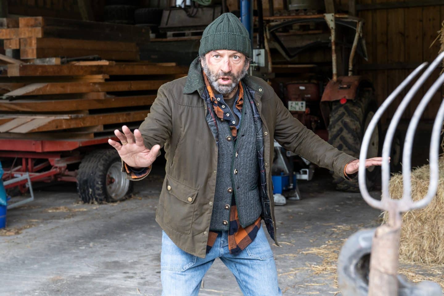 Bauer Gerhard Mangfall (Max Schmidt) ist erschrocken, da er gerade knapp einem versuchten Anschlag auf seinem Bauernhof entkommen ist.