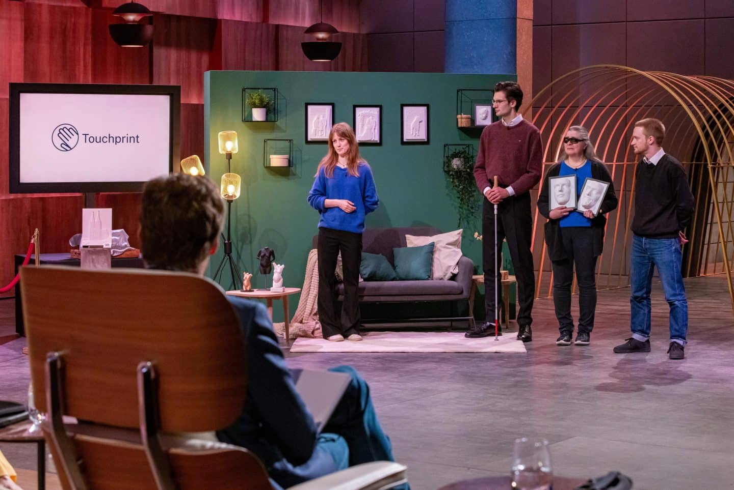 Dyveke Walden (l.), Max Winkler und Linus Walden präsentieren mit Touchprint Foto-Reliefs für Menschen mit Seheinschränkung. Die blinde Nursen Draeger unterstützt sie bei dem Pitch. Sie erhoffen sich ein Investment von 200.000 Euro für 10 Prozent der Firmenanteile. +++ Die Verwendung des sendungsbezogenen Materials ist nur mit dem Hinweis und Verlinkung auf RTL+ gestattet. +++