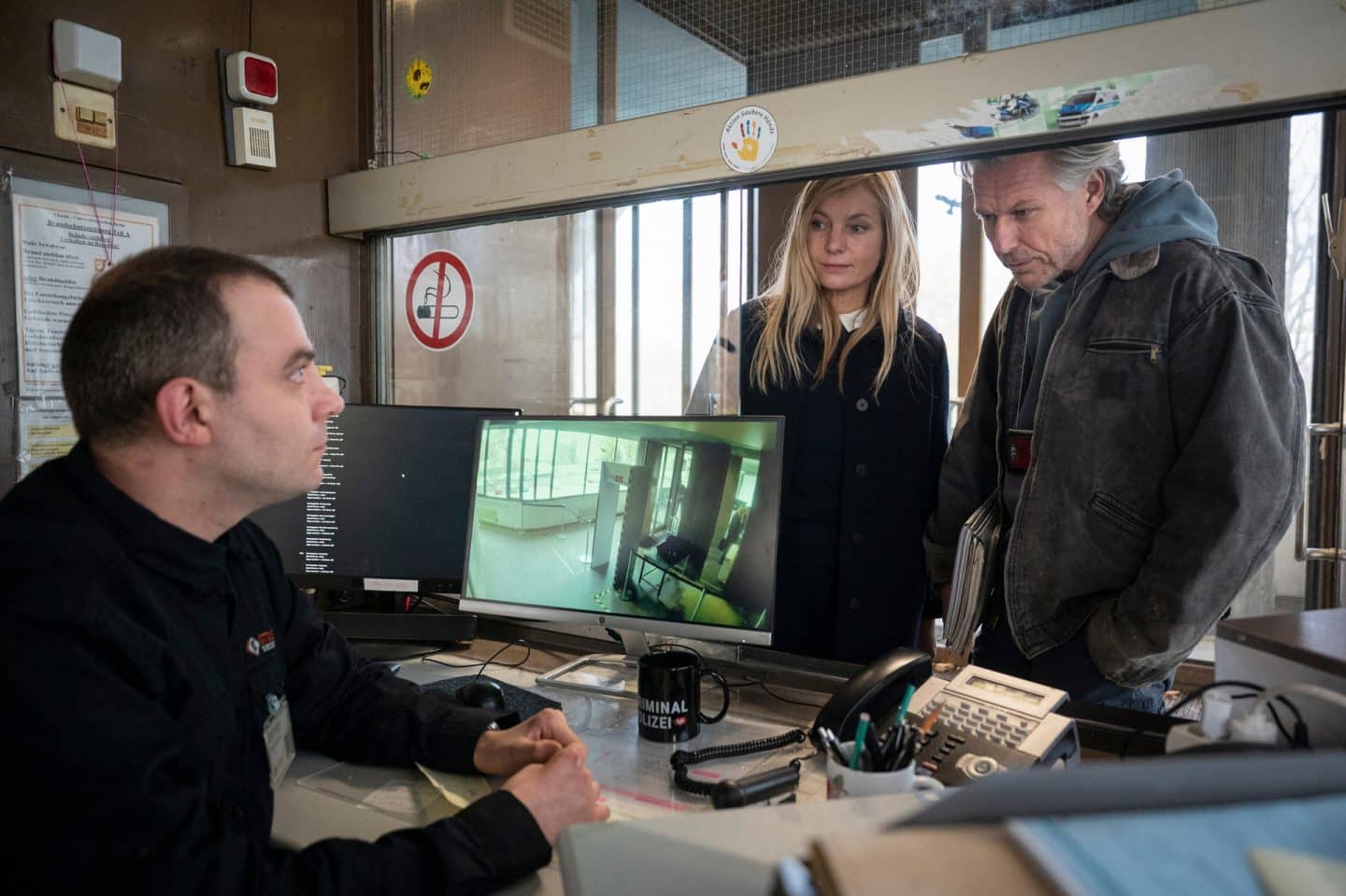 Judith Schrader (Nadja Uhl, M.) und Jochen Montag (Dirk Borchardt, r.) treffen an der Pforte des LKA auf einen Verdächtigen, Adam Achmedow (Eugen Knecht, l.).