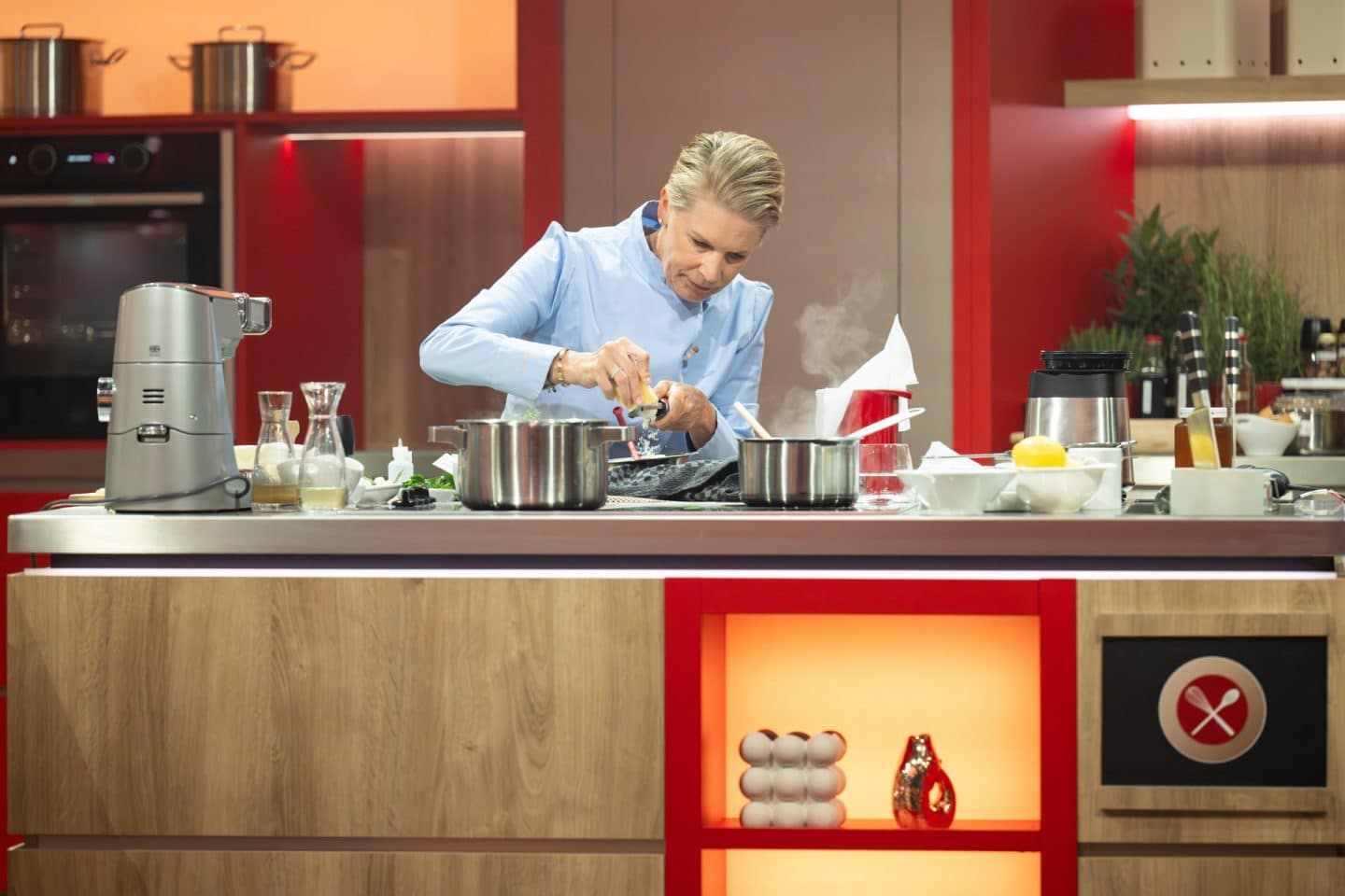 Profiköchin Viktoria Fuchs (r.), im Hintergrund Moderatorin Zora Klipp und Profikoch Johann Lafer