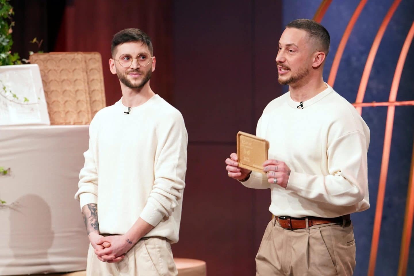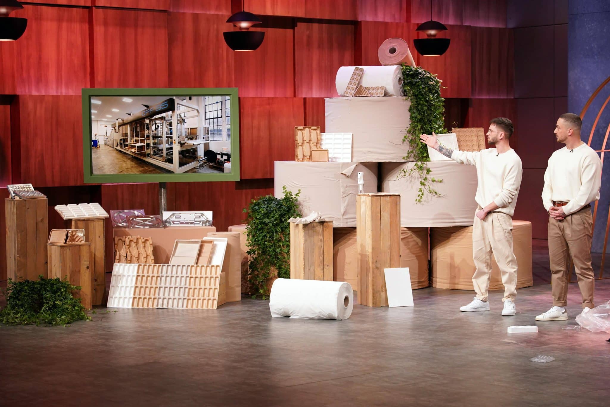 Rene (l.) und Jens Scafarti präsentieren mit „ScaPAP“ ein Herstellungsverfahren durch das Papier von der Rolle zu dreidimensionalen Formkörpern hergestellt werden kann. Sie erhoffen sich ein Investment von 1 Million Euro für 10 Prozent der Firmenanteile. +++ Die Verwendung des sendungsbezogenen Materials ist nur mit dem Hinweis und Verlinkung auf RTL+ gestattet. +++