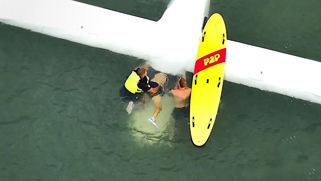 Dramatische Drohnenaufnahmen vor der Küste von Oak Island im US-Bundesstaat North Carolina: Ein Kleinflugzeug war ins Meer gestürzt – Helfer waren zum Glück rechtzeitig zur Stelle.