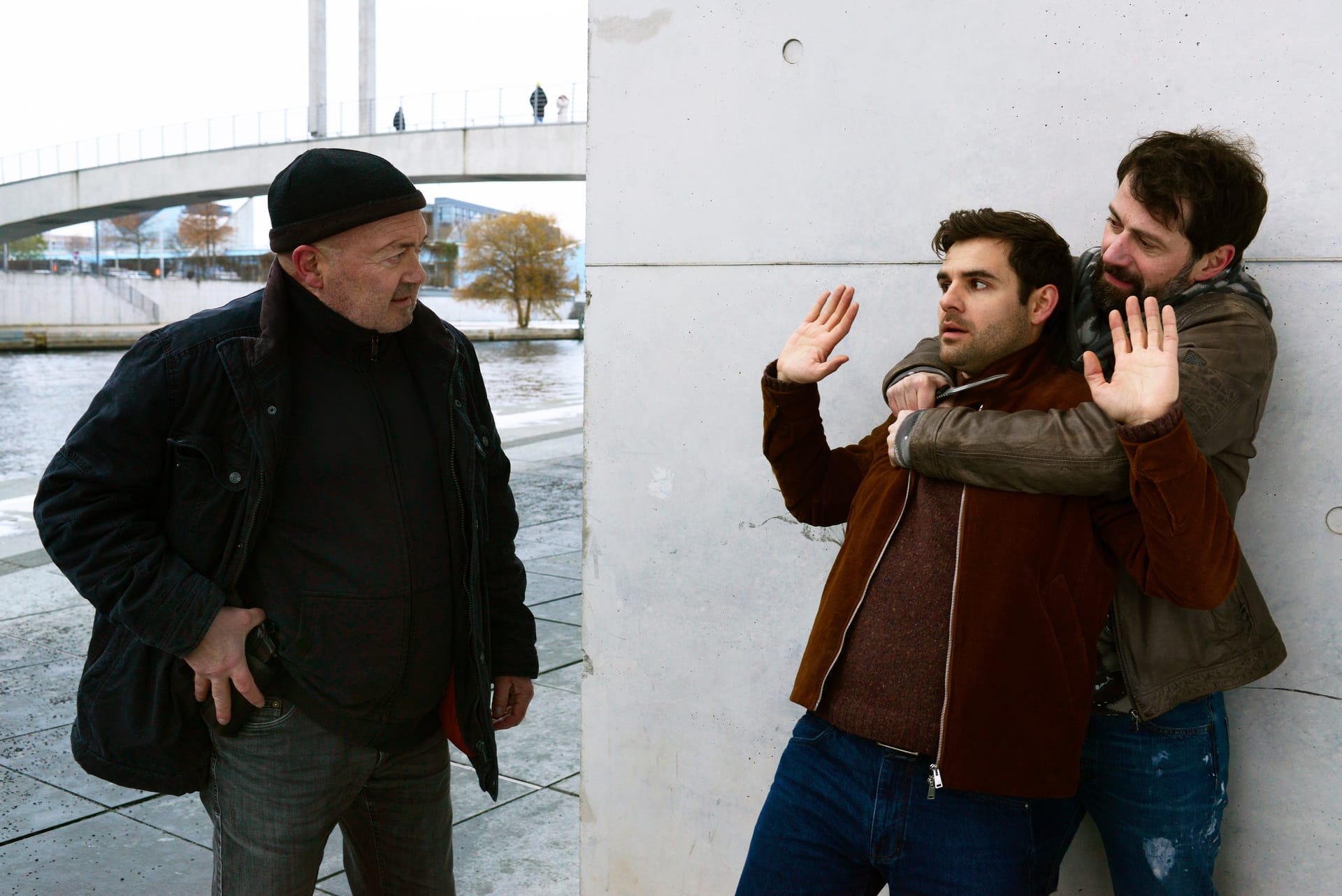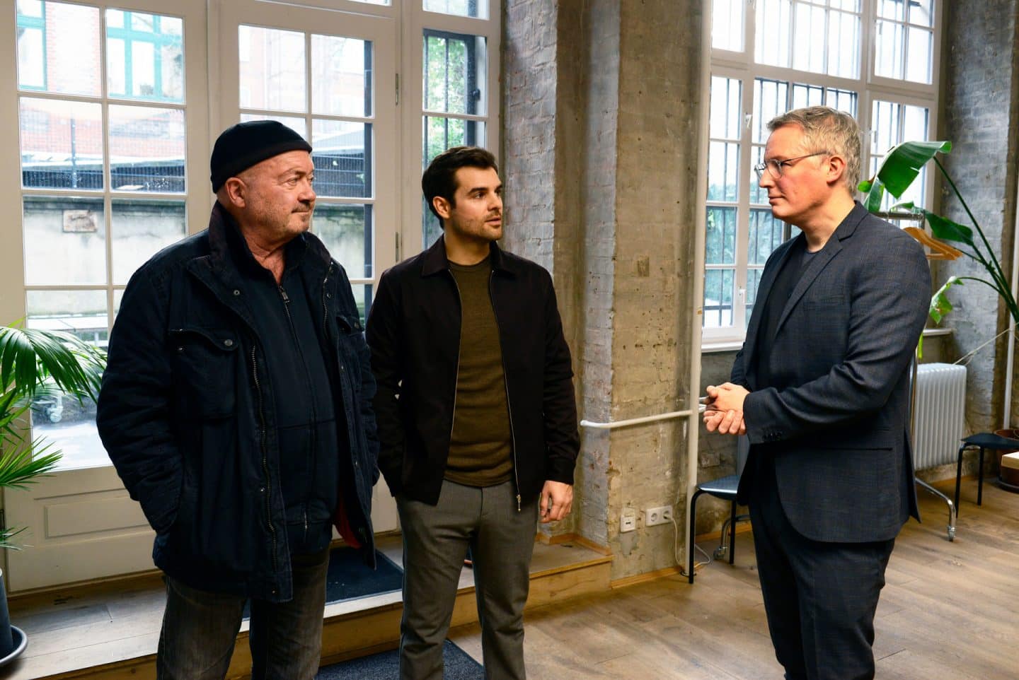 Otto (Florian Martens, l.) und Nils (Lucas Reiber, M.) werden im Architekturbüro von Joachim Kern (Max Urlacher, r.) empfangen. Sein Chef wurde ermordet.