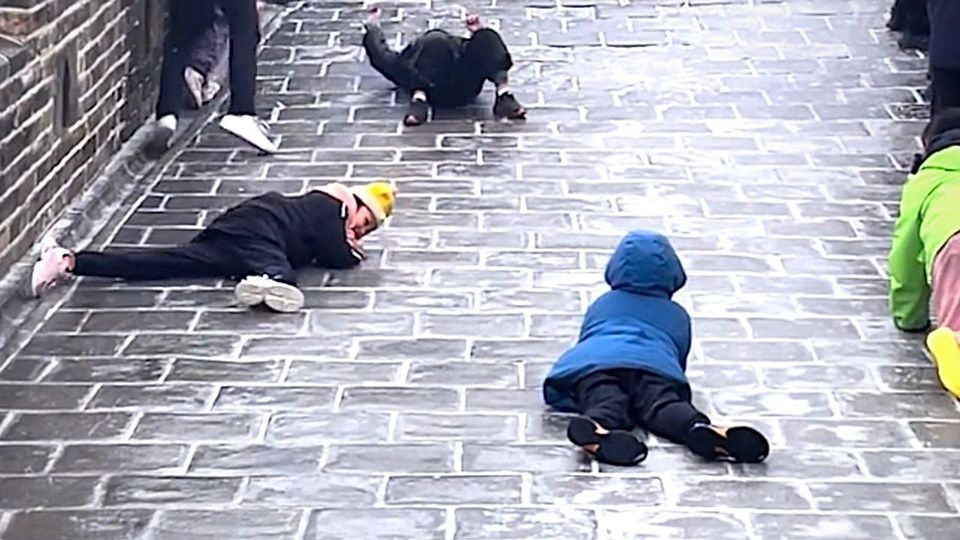 Touristen besuchten am Sonntag die Chinesische Mauer – und hatten ein Problem: Bei eiskalten Temperaturen war der Boden gefroren. Auf der glatten Oberfläche ging es einfach nicht vorwärts.