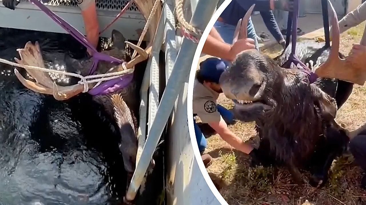 Waldbewohner in Not: Ein Elch steckte in Estes Park im US-Bundesstaat Colorado in einem Kanal fest und drohte zu ertrinken. In einer zweistündigen Rettungsaktion wurde das Tier aus dem Wasser geholt.