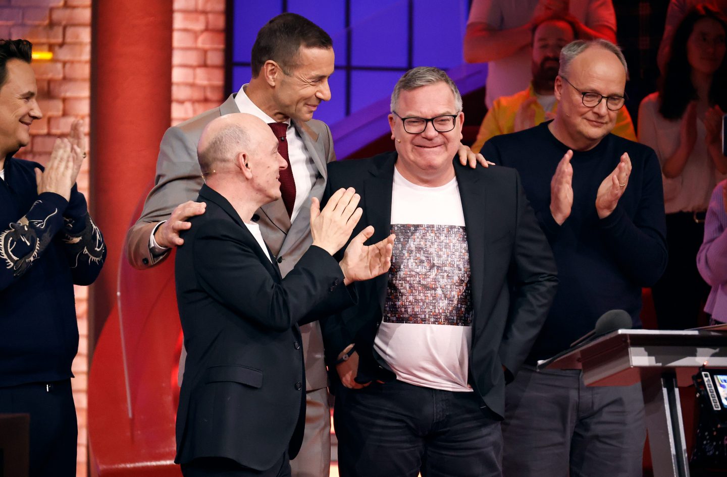 ARD/NDR WER WEISS DENN SOWAS XXL, „Das unvorstellbare Wissensquiz mit Kai Pflaume“, am Samstag (26.04.25) um 20:15 Uhr im ERSTEN. Guido Maria Kretschmer, Bernhard Hoëcker, Kai Pflaume und Olvier Welke (v.l.n.r) nehmen Abschied von Elton (2.v.r) © NDR/Matzen/ARD/UFA SHOW&FACTUAL, honorarfrei – Verwendung gemäß der AGB im engen inhaltlichen, redaktionellen Zusammenhang mit genannter NDR-Sendung und bei Nennung „Bild: NDR/Matzen/ARD/UFA SHOW&FACTUAL“ (S2+). NDR Presse und Information/Fotoredaktion, Tel: 040/4156-2333 oder -2305, [email protected]