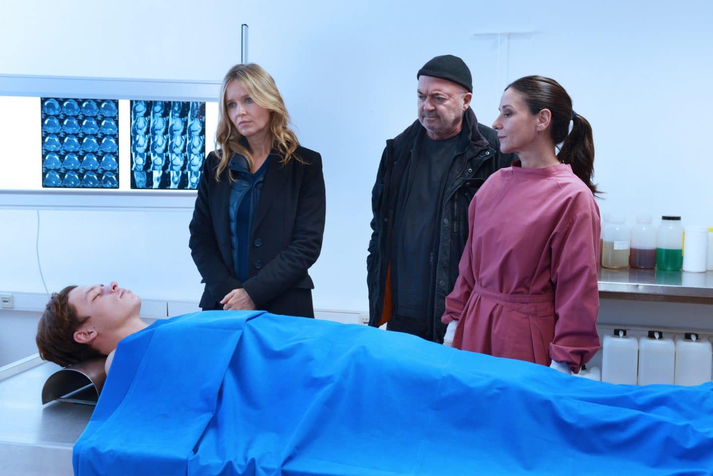 Dr. Simkeit (Eva Sixt, r.), Otto (Florian Martens, 2.v.r.), Linett (Stefanie Stappenbeck, 2.v.l.) rätseln, warum Lennard Friedrich (Junis Marlon, l.) sterben musste. Könnte er ein unehelicher Sohn des zuerst ermordeten Bernhard Paulsen sein?