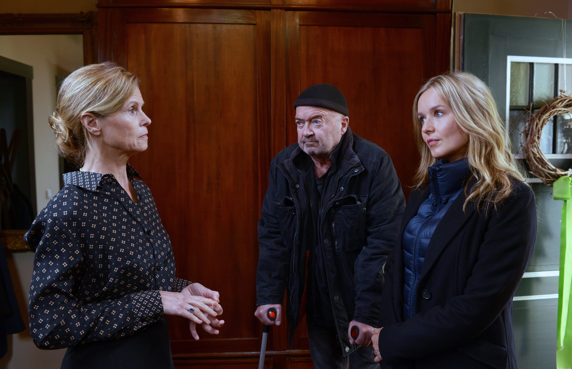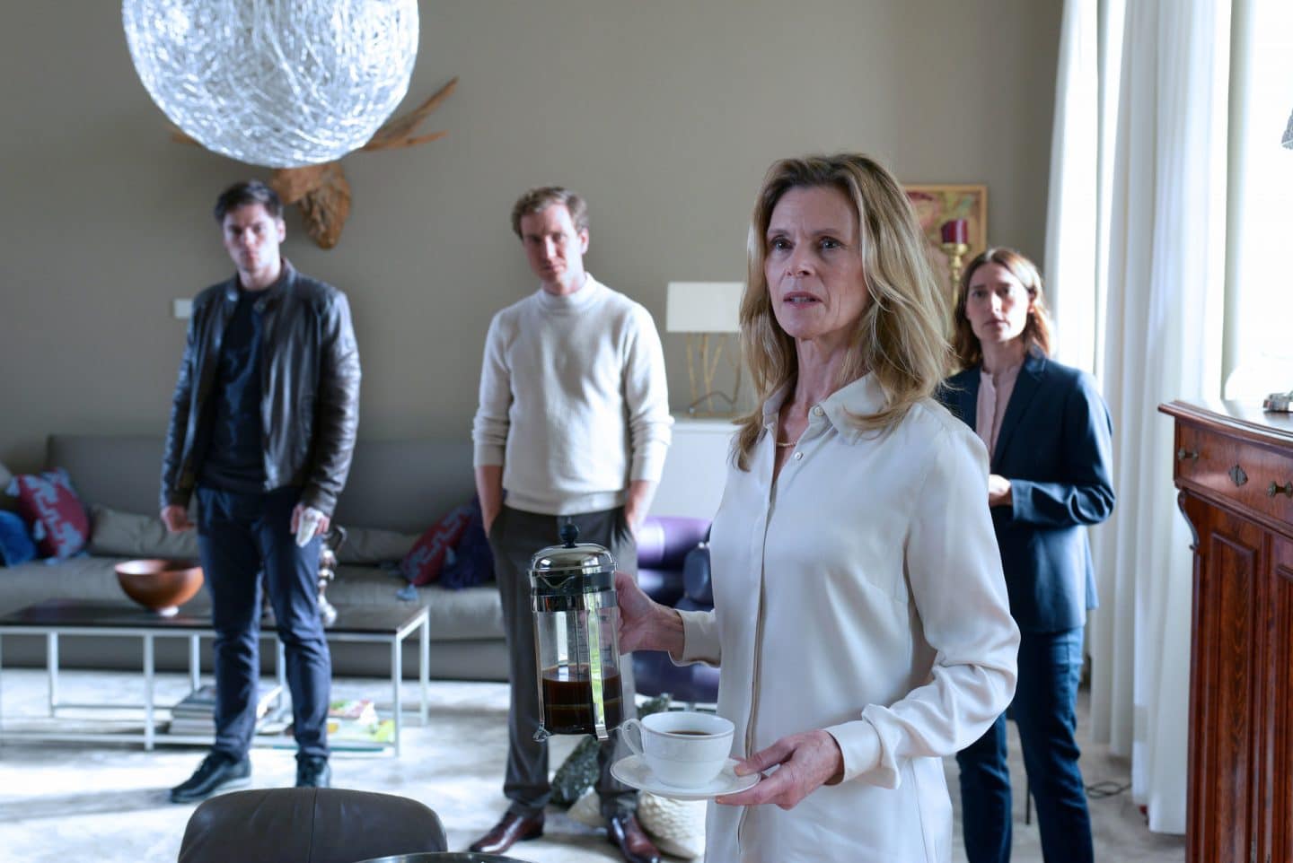Erika (Leslie Malton, 2.v.r.) erklärt ihren Kindern, Lukas (Theo Trebs, l.), Jens (Jan Krauter, 2.v.l.) und Sabine (Lisa Marie Janke, r.), dass ihr Vater mit ihnen über sein Testament sprechen will.