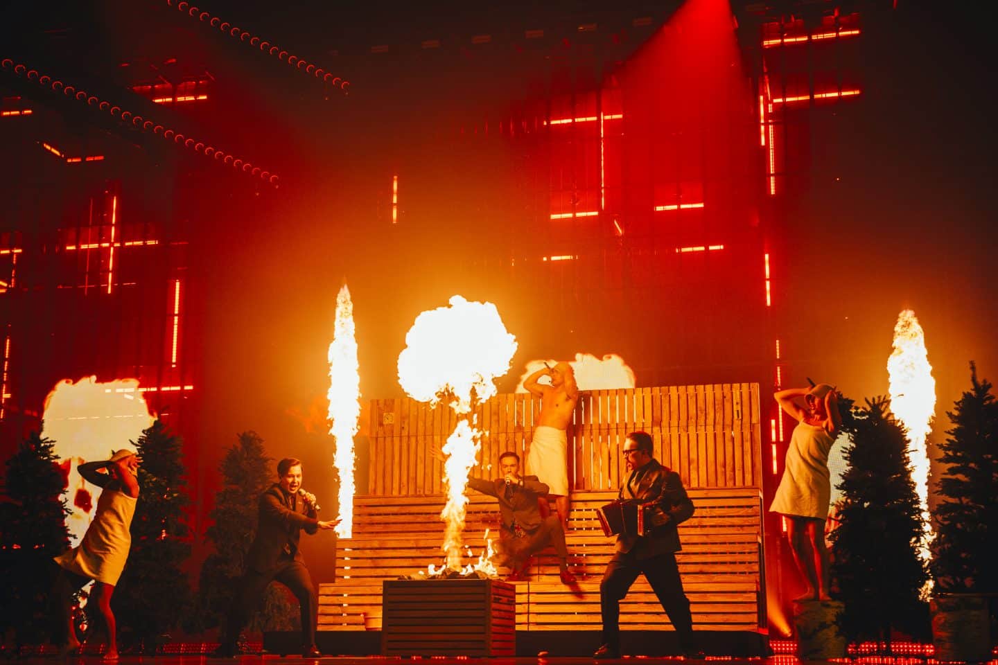 KAJ performing Bara Bada Bastu for Sweden at the First Semi-Final in St. Jakobshalle