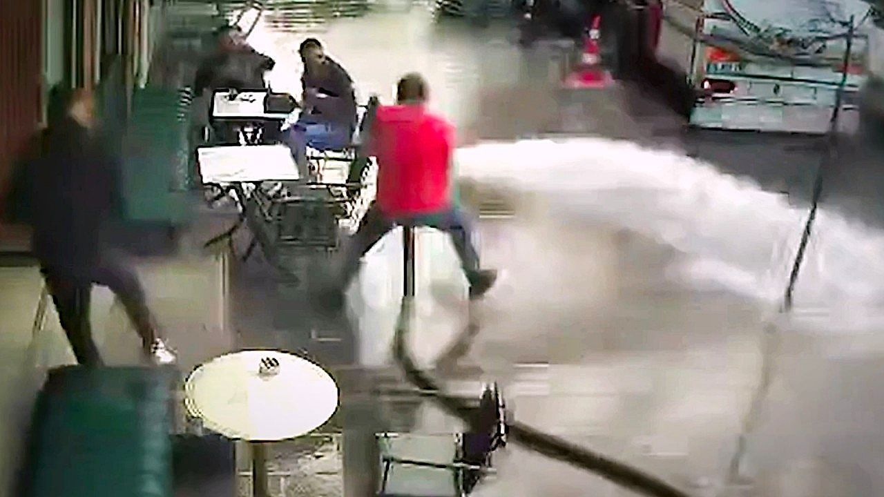 Ein peinliches Missgeschick leistete sich der Besitzer eines Cafés in Istanbul Anfang Oktober. Der Mann wollte eigentlich nur den Gehweg vor seinem Laden sauber spritzen, als er plötzlich die Kontrolle über den Wasserschlauch verlor – und seinen Gästen eine kalte Dusche verpasste.