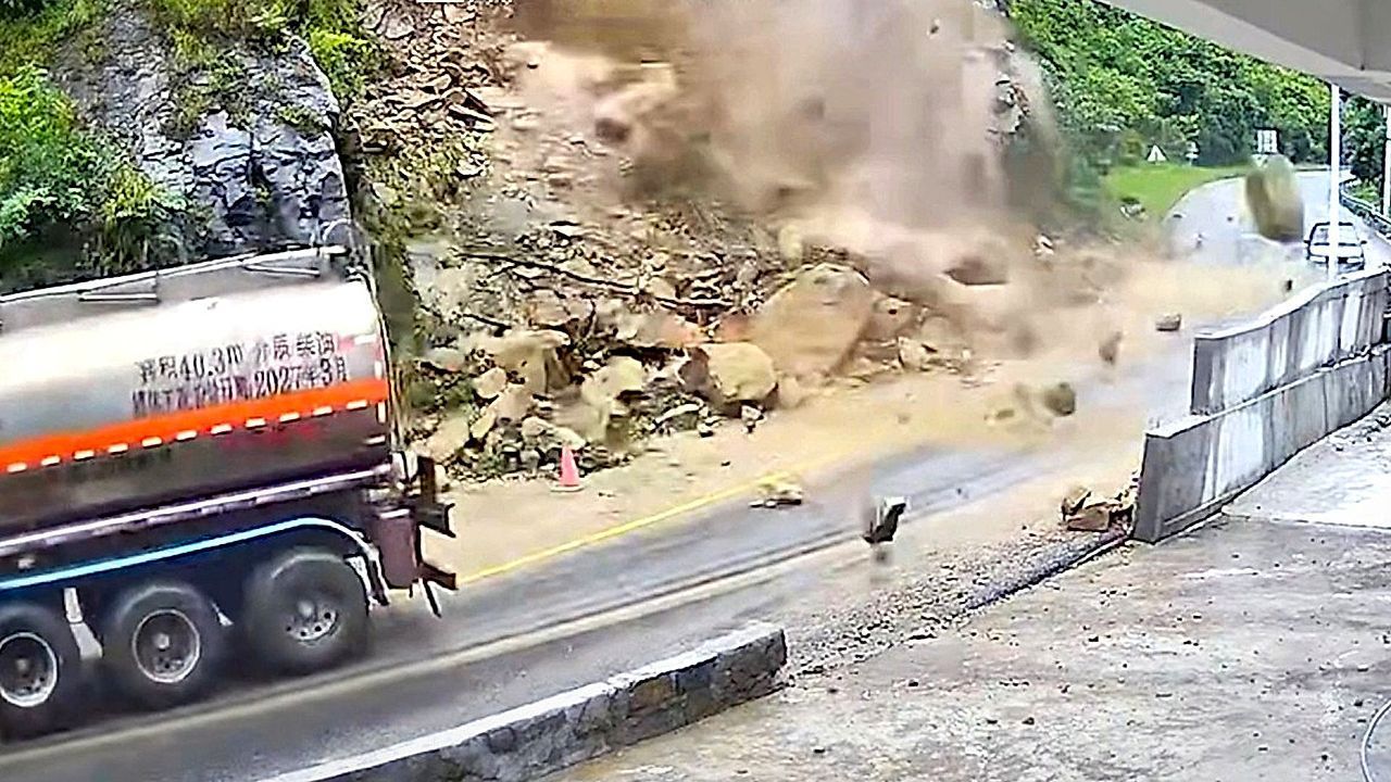 In der chinesischen Provinz Yunnan war ein Tankwagen auf einer Bergstraße unterwegs, als sich Felsbrocken lösten. Der Fahrer riskierte alles.