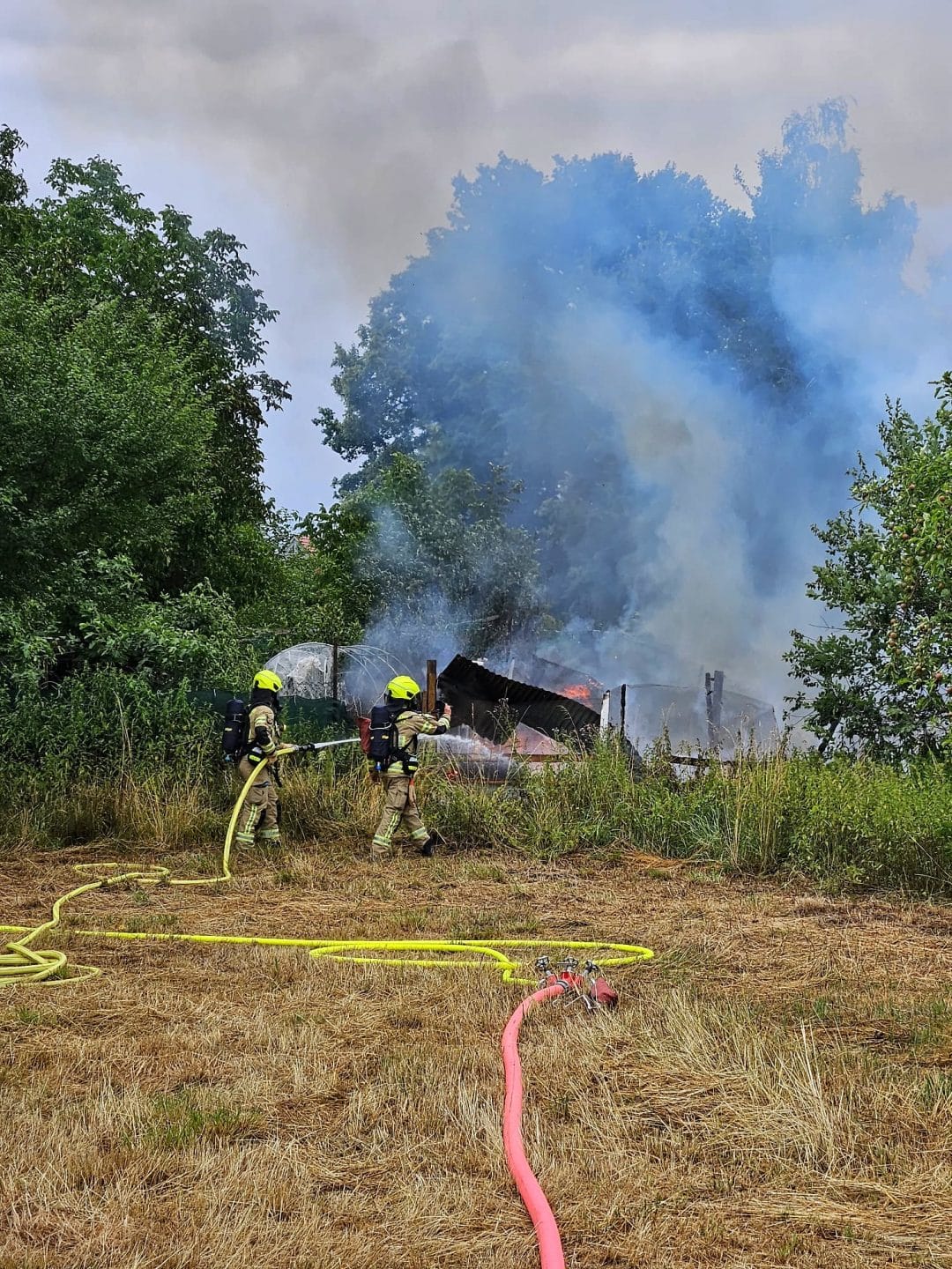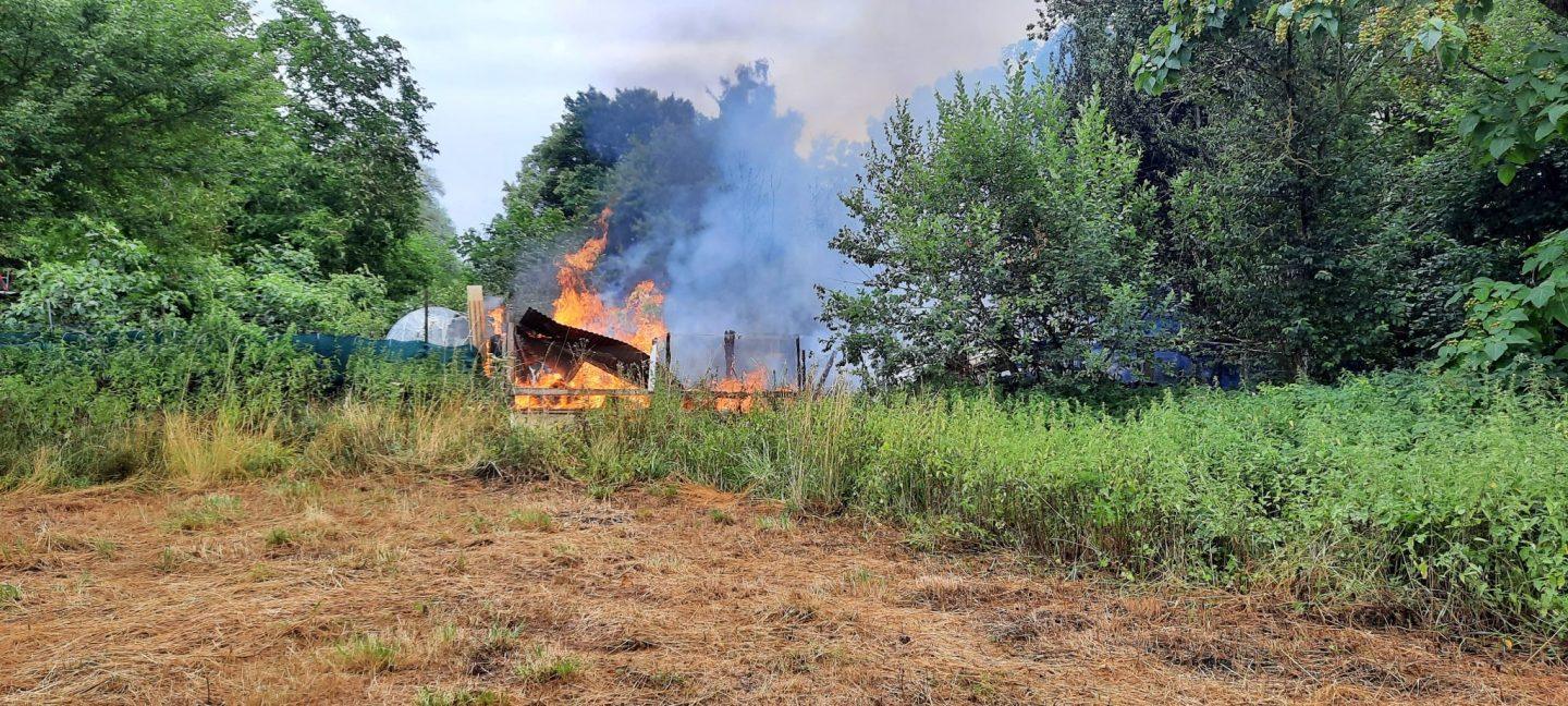 Am Einsatzort brannten die Gartenhütte und das Geflügelgehege bereits in voller Ausdehnung. Für die darin untergebrachten Tiere kam jede Hilfe zu spät – sie verendeten im Feuer.