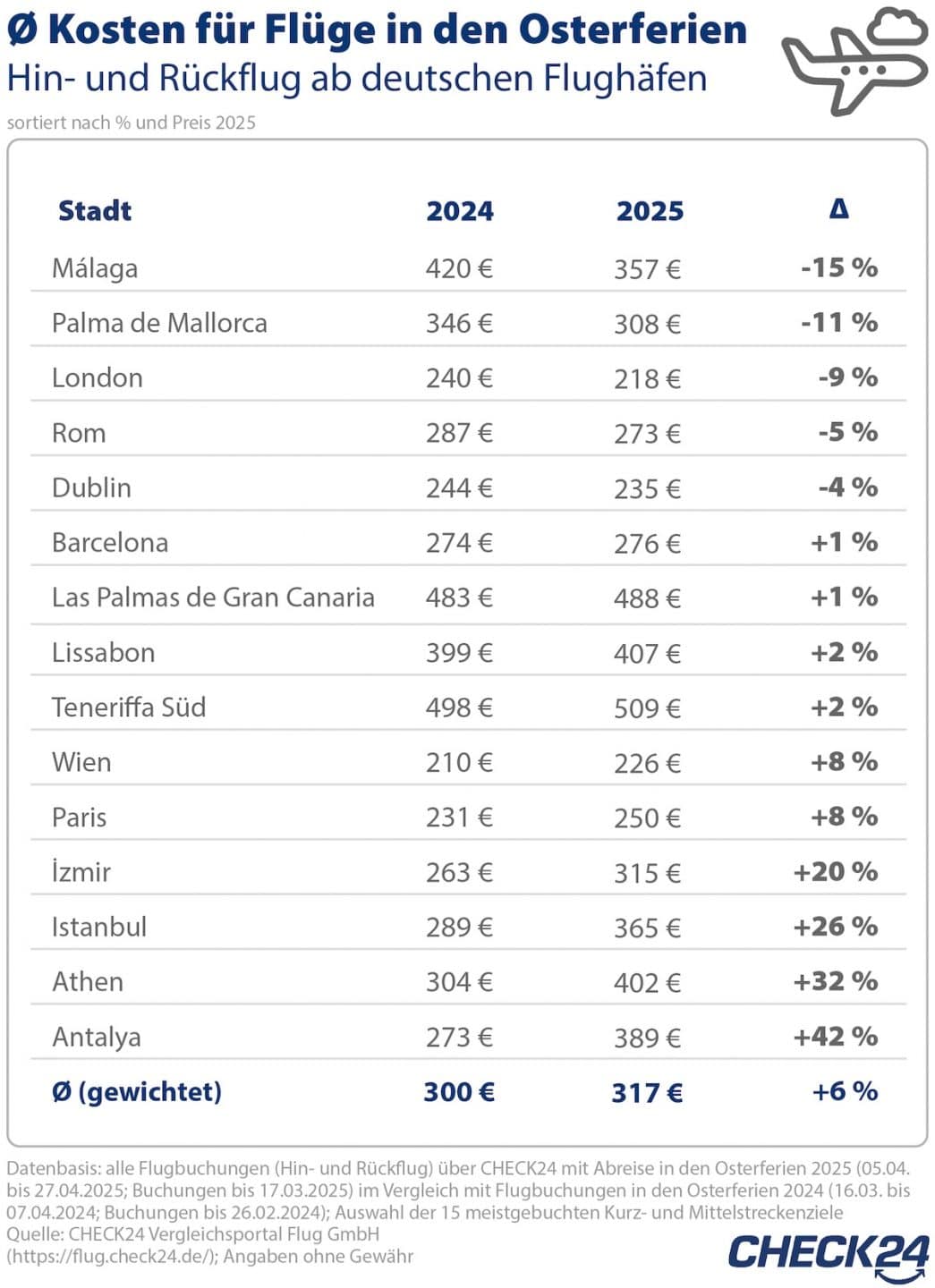 Datenbasis: alle Flugbuchungen (Hin- und Rückflug) über CHECK24 mit Abreise in den Osterferien 2025 (05.04. bis 27.04.2025; Buchungen bis 17.03.2025) im Vergleich mit Flugbuchungen in den Osterferien 2024 (16.03. bis 07.04.2024; Buchungen bis 26.02.2024); Auswahl der 15 meistgebuchten Kurz- und Mittelstreckenziele und fünf meistgebuchten Langstreckendestinationen; Stand der Berechnung 17.03.2025