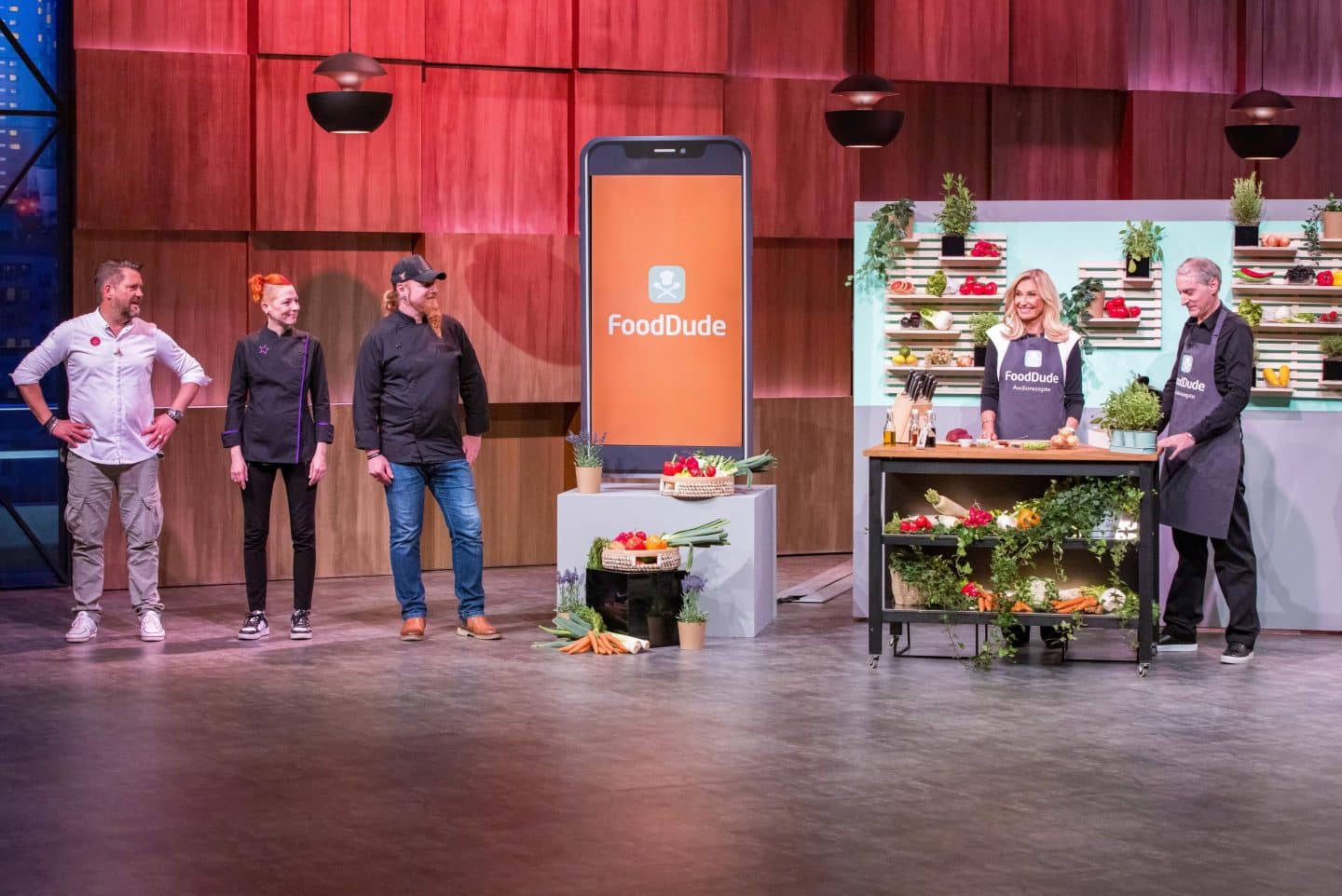 Mike Süsser (l.), Meta Hiltebrand und Ludwig „Lucki“ Maurer präsentieren bei „FoodDude“ ihre besten Original-Rezepte zum Nachkochen. Rechts Gründer Sven Torner mit Investorin Dagmar Wöhrl.+++ Die Verwendung des sendungsbezogenen Materials ist nur mit dem Hinweis und Verlinkung auf RTL+ gestattet. +++