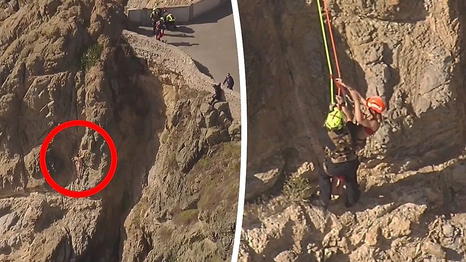 Gefährlicher Einsatz der Feuerwehr von San Francisco: Eine Frau in einem Bikini steckte an einer Klippe nahe des Wahrzeichens Cliff House fest. Ein Retter seilte sich zu ihr ab.