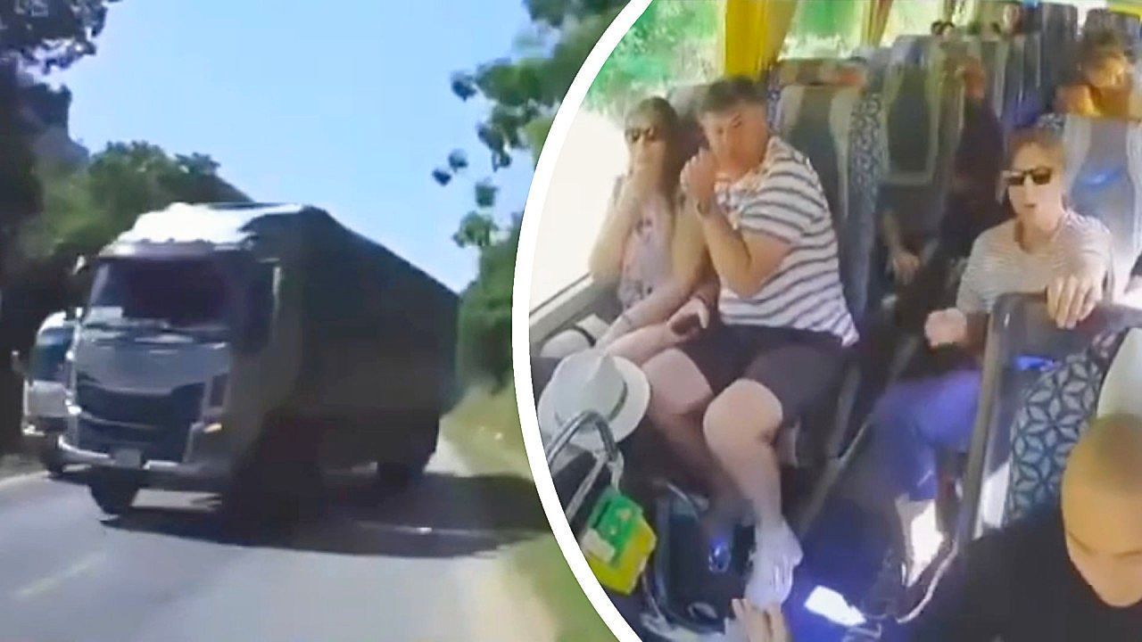 Touristen waren in der vietnamesischen Provinz Tuyen Quang mit einem Bus auf einer Landstraße unterwegs, als sich plötzlich ein überholender Lkw näherte. Der Busfahrer reagierte sensationell.