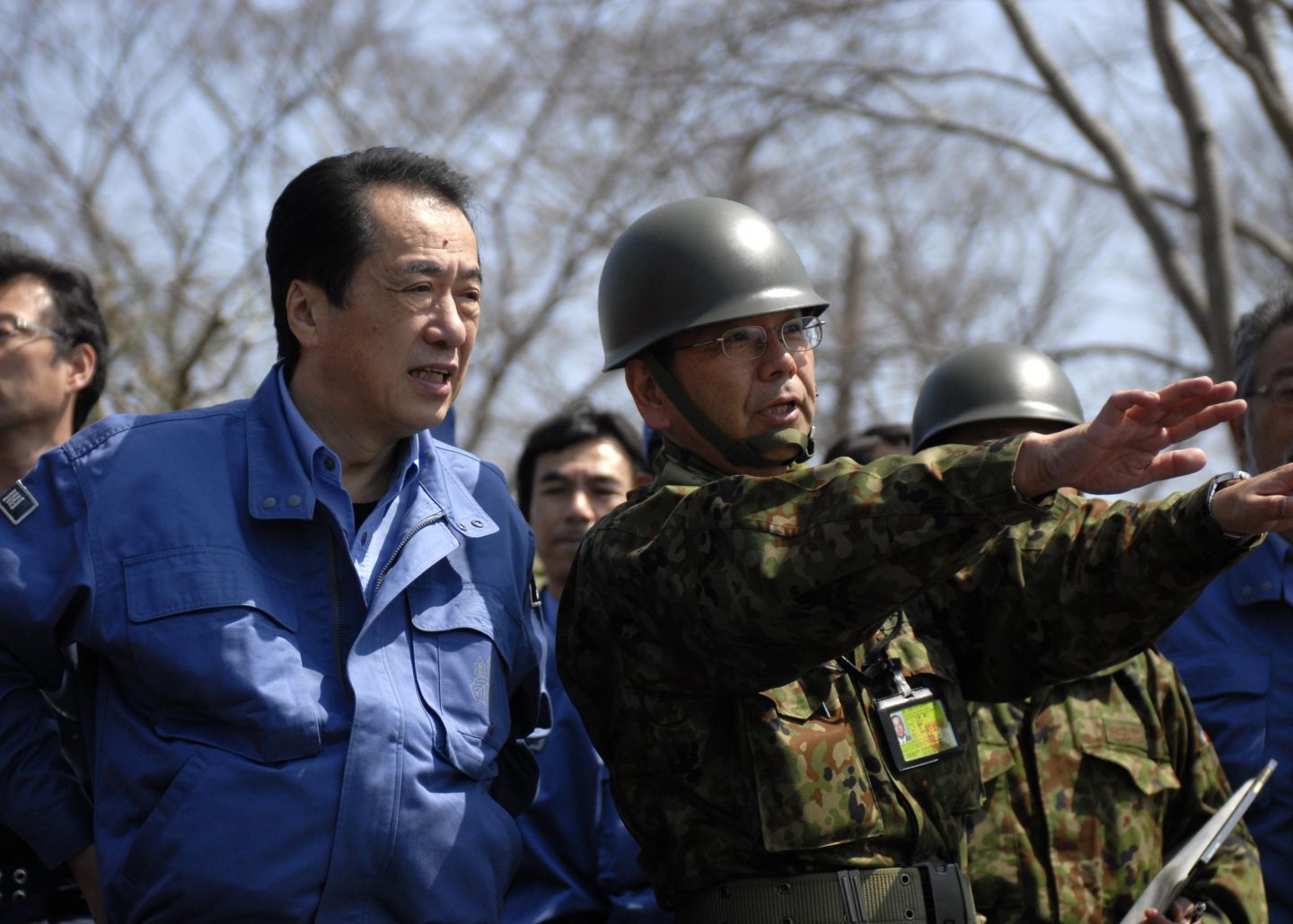 Japan’s Prime Minister Naoto Kan is briefed about the state of Ishanomaki High School by Japanese Ground Self Defense Force Lt. Gen. Yuji Kuno, the Comander of the 6th Division, JGSDF, at Ishanomaki City’s high school, April 10. Kan visited the school and took time to shake hands and voice his appreciation of the U.S.’s support in the wake of the level 9.1 earthquake and the ensuing tsunami, March 11.