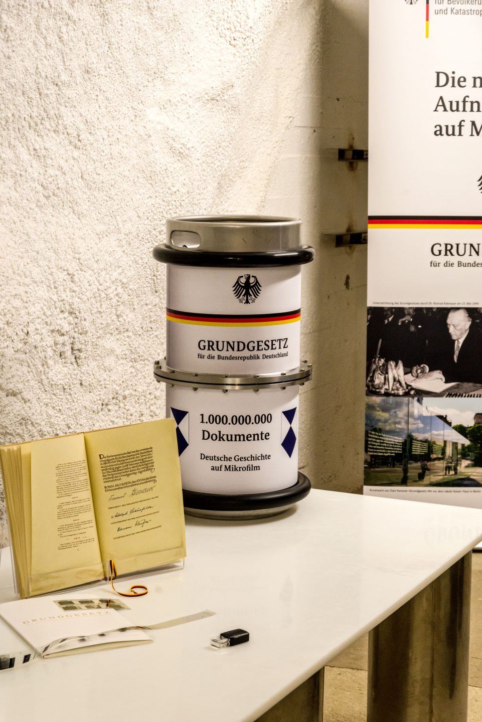 Der Behälter 2165 mit dem Grundgesetz, dem 1.000.000.000 Bild der Archivs, Ein Faksimile des Grundgesetztes Die Seit mit den Unterschriften, ein Archivfilm und eine Lupe 6x