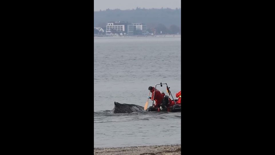 An der Ostseeküste in Schleswig-Holstein strandet ein großer Wal. Auch Experten aus Büsum begutachten das Tier genauer. Vermutlich ist es ein Buckelwal. Zahlreiche Einsatzkräfte sind im Einsatz.