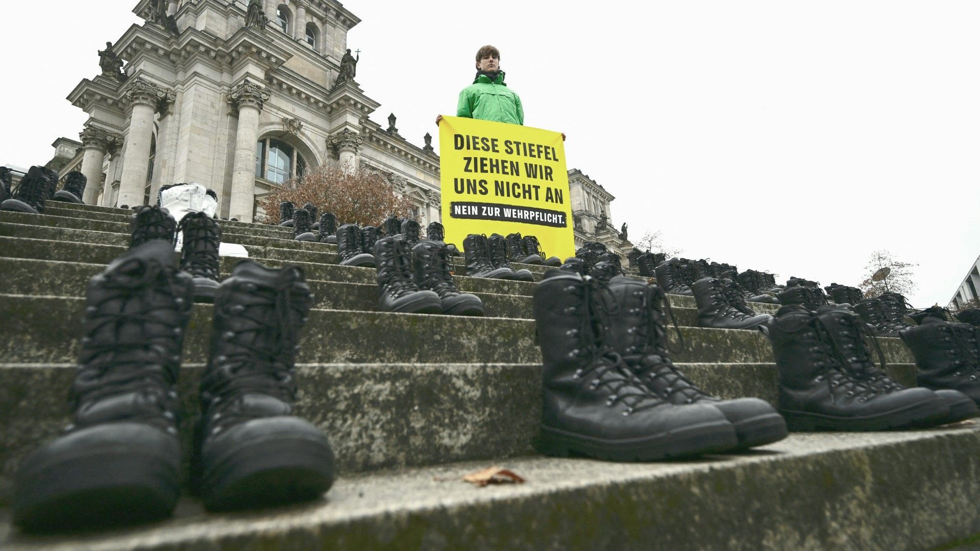 Greenpeace-Aktivisten haben vor dem Reichstag in Berlin gegen eine Wiedereinführung der Wehrpflicht demonstriert. Unter dem Motto "Diesen Schuh ziehen wir uns nicht an" platzierten die Umweltschützer 150 Paar Bundeswehrstiefel im Regierungsviertel. Die Aktion zielt auf die Parlamentarier, die im Verteidigungsausschuss derzeit über das Gesetz beraten.