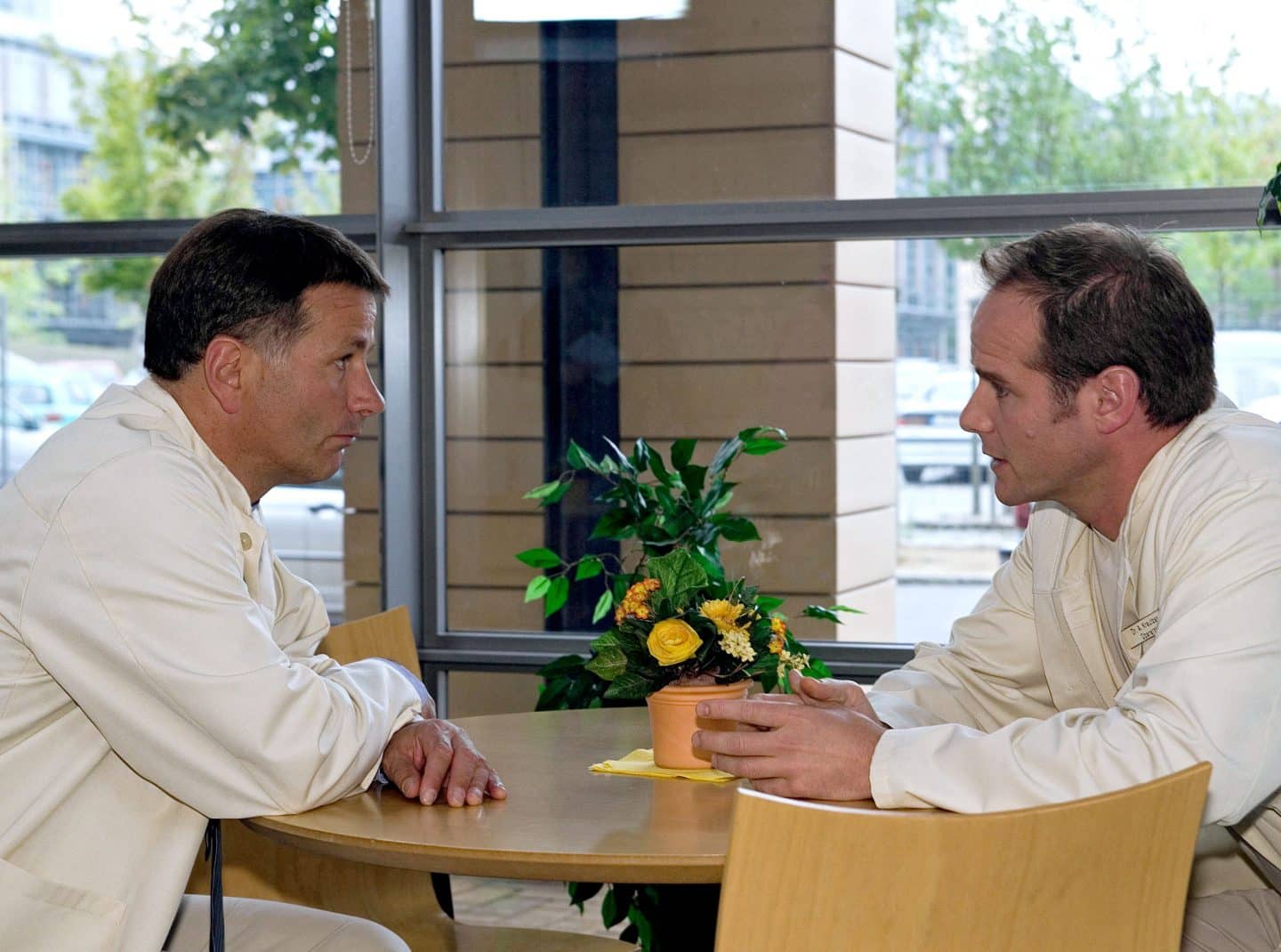 ARD/MDR IN ALLER FREUNDSCHAFT 290, „Hochzeitsglocken“, am Dienstag (12.08.25) um 21:00 Uhr im ERSTEN. Roland Heilmann (Thomas Rühmann, li.) und Achim Kreutzer (Johannes Steck, re.) haben ihre eigene Theorie zum Unfallhergang Viktor Hauers. Sie glauben, dass er simuliert, um mehr Geld aus der Unfallversicherung zu schlagen. © MDR/Krajewski, honorarfrei – Verwendung gemäß der AGB im engen inhaltlichen, redaktionellen Zusammenhang mit genannter MDR-Sendung bei Nennung „Bild: MDR/Krajewski“ (S2). MDR/HA Kommunikation, 04360 Leipzig, Tel: (0341) 300 6477 oder – 6463