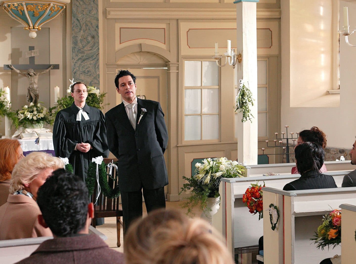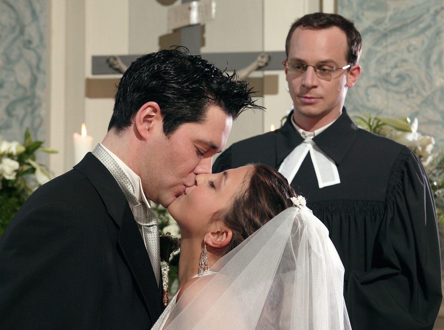 ARD/MDR IN ALLER FREUNDSCHAFT 290, „Hochzeitsglocken“, am Dienstag (12.08.25) um 21:00 Uhr im ERSTEN. Philipp Brentano (Thomas Koch, re.), der Pfarrer (Tobias Schulze, li.) und die Hochzeitsgäste warten darauf, dass die Braut in die Kirche geführt wird. © MDR/Krajewski, honorarfrei – Verwendung gemäß der AGB im engen inhaltlichen, redaktionellen Zusammenhang mit genannter MDR-Sendung bei Nennung „Bild: MDR/Krajewski“ (S2). MDR/HA Kommunikation, 04360 Leipzig, Tel: (0341) 300 6477 oder – 6463