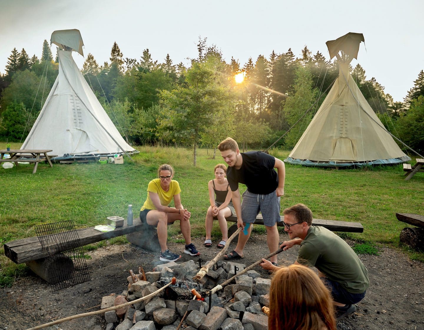 Baden Württemberg, Münsingen, Campingplatz Hopfenburg. Eine Familie sitzt rund um ein Lagerfeuer und röstet Stockbrot. Im Hintergrund sind die Tipis zur Übernachtung zu sehen.