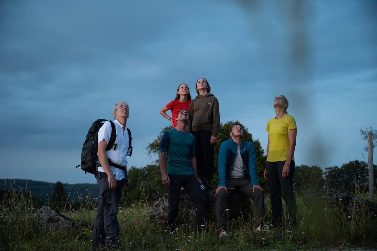 Gemeinsam wandert die Gruppe zum nahegelegenen ehemaligen Truppenübungsplatz Münsingen. Durch die kilometerweite Abwesenheit von Besiedlung ist der Nachthimmel hier besonders dunkel und klar. Andächtig sucht die Familie unter Anleitung des Experten den Großen Wagen, die Kassiopeia und das Sommerdreieck, gebildet aus den Sternen der Sternbilder Schwan, Leier und Adler.