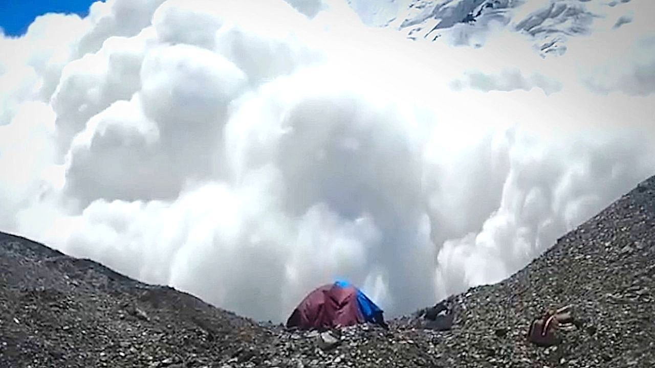 Am G1/G2-Basislager im Karakorum-Gebirge im Himalaya filmten Bergsteiger den Moment, als eine gewaltige Lawine zu Tal donnerte. Eine riesige weiße Wolke raste auf die Kletterer zu.
