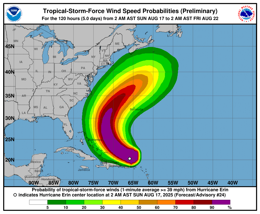 Derzeit bewegt sich Erin nordwestlich der Jungferninseln in Richtung Westen, mit einem prognostizierten Richtungswechsel nach Nordwesten und dann Norden. Ein direkter Landfall auf dem US-Festland wird nach jetzigem Stand nicht erwartet. Trotzdem mahnen Experten zur Vorsicht: Die mit dem Sturm verbundenen hohen Wellen und starken Strömungen können an der gesamten Ostküste der USA, von Florida bis Neuengland, für gefährliche Badebedingungen sorgen.
